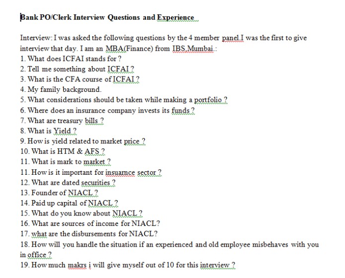 Interview questions for Bank Probationary Officer:- Why do you want to join in banking sector? Tell me about yourself? What does your name means? What are your strengths? What are your weakness? Why have you left your previous job? Are you willing to work anywhere in india? Why are you switching your career? What is a bank? Do you have any questions for us? Some of the banking terms related to interview questions? Deposit, Asset, Limited liabilities, KYC(Know Your Customer), Repo rate, Poverty line, Demand Drafts, Decod Deposits, Bank rate, MSR, CLR, Mutual Funds, Current Chest, CRR, MCC. ![]() ![]() Best of luck |