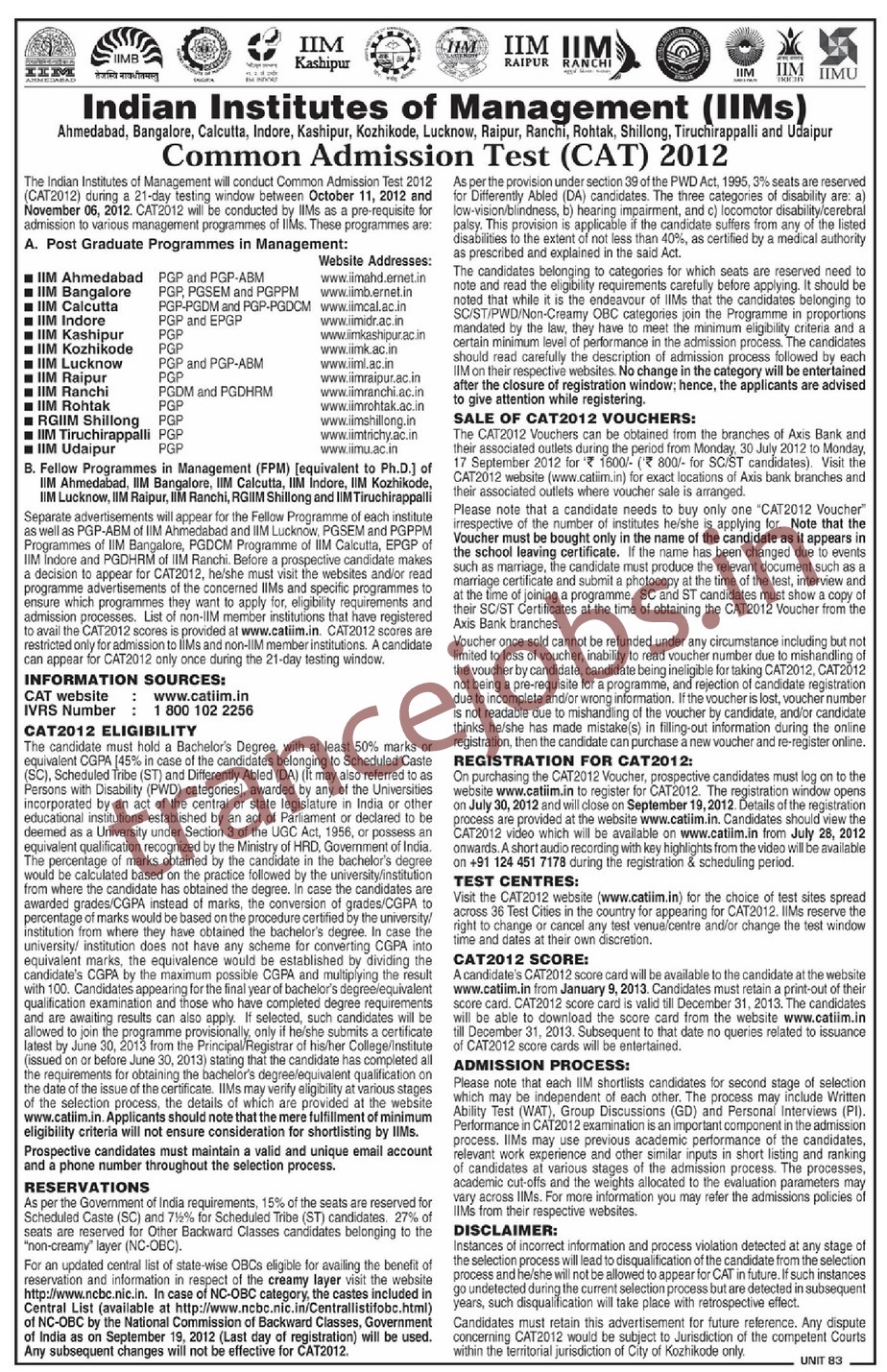 ![]() ![]() CAT Stands Common Entrance Test CAT Entrance Exam Eligibility : Candidates must have a Bachelor's Degree with at least min of 50% aggregate from a recognized university . 45% for SC/ST Candidates There is no age limit for applying Candidates 15% of the seats are reserved for SC candidates 71/2% for the seats are reserved ST candidates 27% for the seats are reserved OBC candidates (non creamy) 3% for the seats are reserved Differently Abled ![]() |