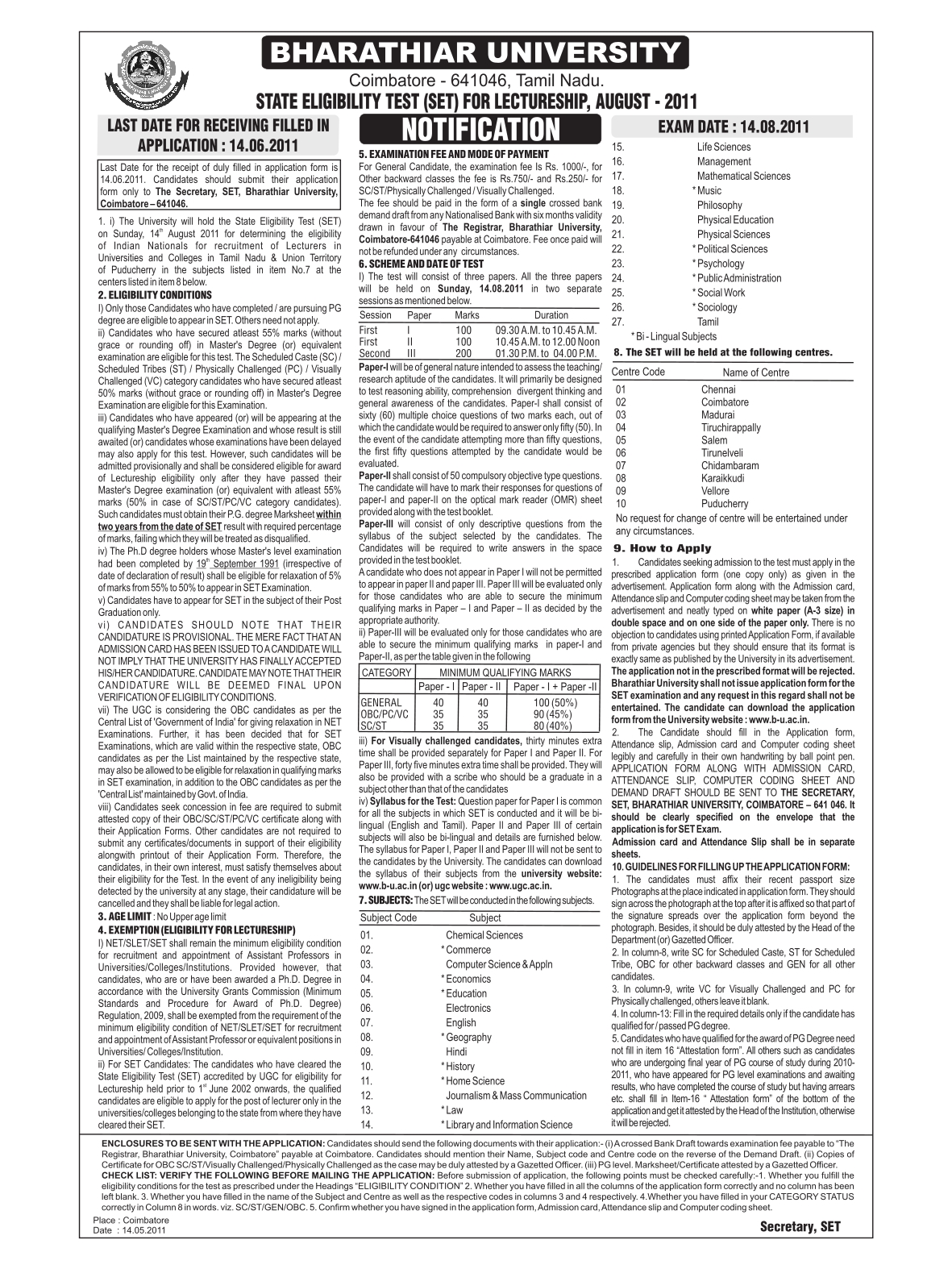 This is same for the National Eligibility Test. The difference between two exams is that NET is conducted for central government colleges by SLET is conducted by all the states for their respective colleges. Even though SET/NET are two different exams, the criteria to appear in it is the same. Whether its SLET or National Eligibility Test, the criteria is set by the University Grants Commission. Please check the entire criteria below. Eligibility 1. You should be citizen of India. 2. Post graduation degree in any stream. 3. At least 55 percent marks in master degree. 4. The requirement for SC/ST is 50 percent. 5. Final year students are also eligible to appear for SLET. 6. But they will have to submit their master degree within 2 years of passing SLET. 7. Your NET subject should be relevant to master degree course. 8. You have unlimited number of attempts. Age Limit 1. The maximum age limit is 28 years if applying for Junior Research Fellowship. 2. There is upto 3 years relaxation for OBC. 3. SC/ST get 5 years relaxation. 4. There is no upper age limit if candidate is applying for College Lectureship. |