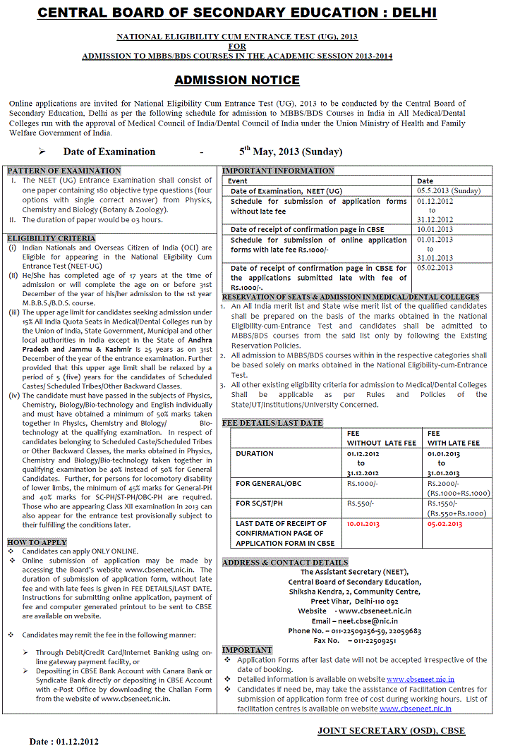 Commencement of Submission of Online Application : 01.12.2012 Online Application submission last date without late fee : 31.12.2012 submission of online application with late fee : 01.01.2013 last date of receipt of confirmation page in CBSE , application without late fee : 10.01.2013 last date of receipt of confirmation page in CBSE , application with late fee : 05.02.2013 NEET UG 2013 will be held : 05.05.2013 ![]() |
