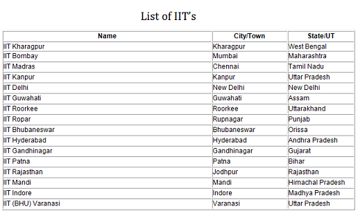 IIT-INDORE IIT-VARANASI IIT-BHUVANESHWAR IIT-ROORKEE IIT-HYDERABAD IIT-ROPER IIT-RAJASTAN IIT-DELHI IIT-KANPUR IIT-CHENNAI IIT-KHARAGPUR IIT-GWAHATHI IIT-BOMBAY IIT-PATNA |